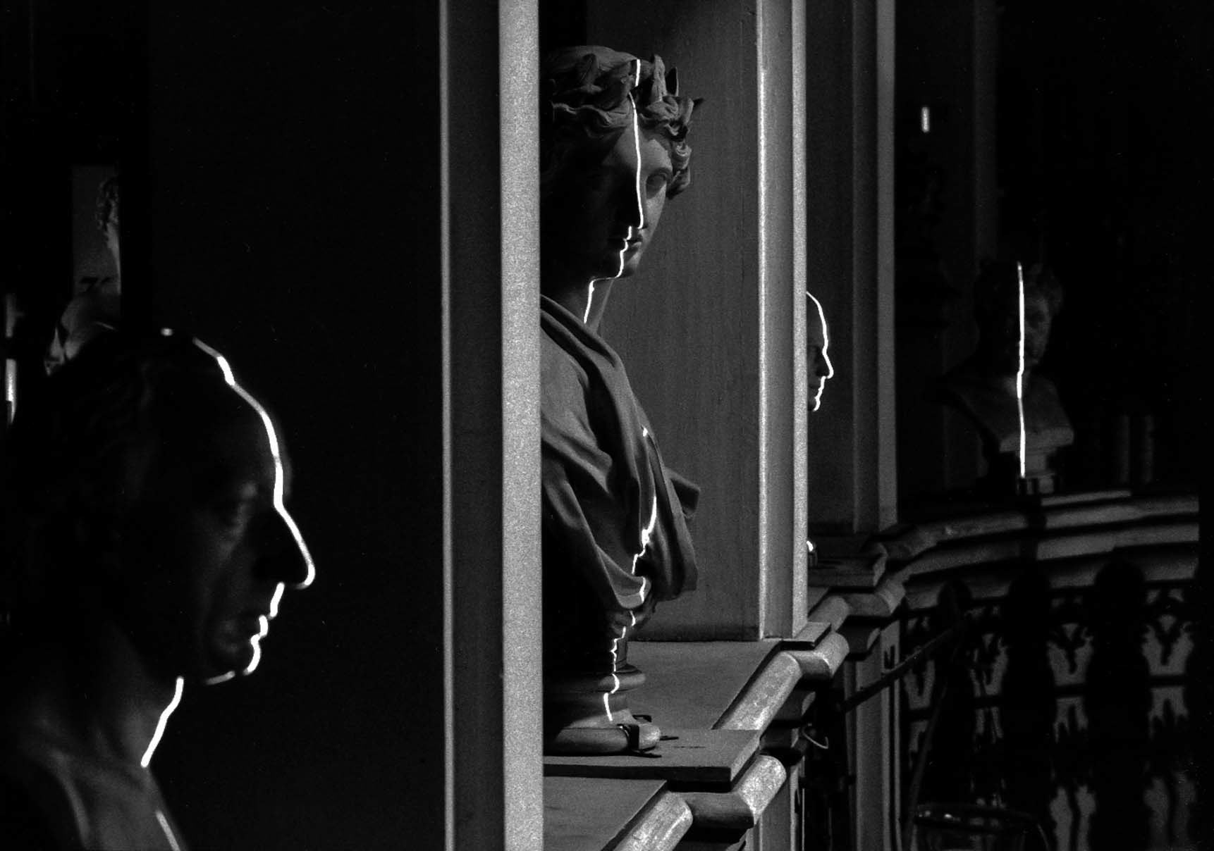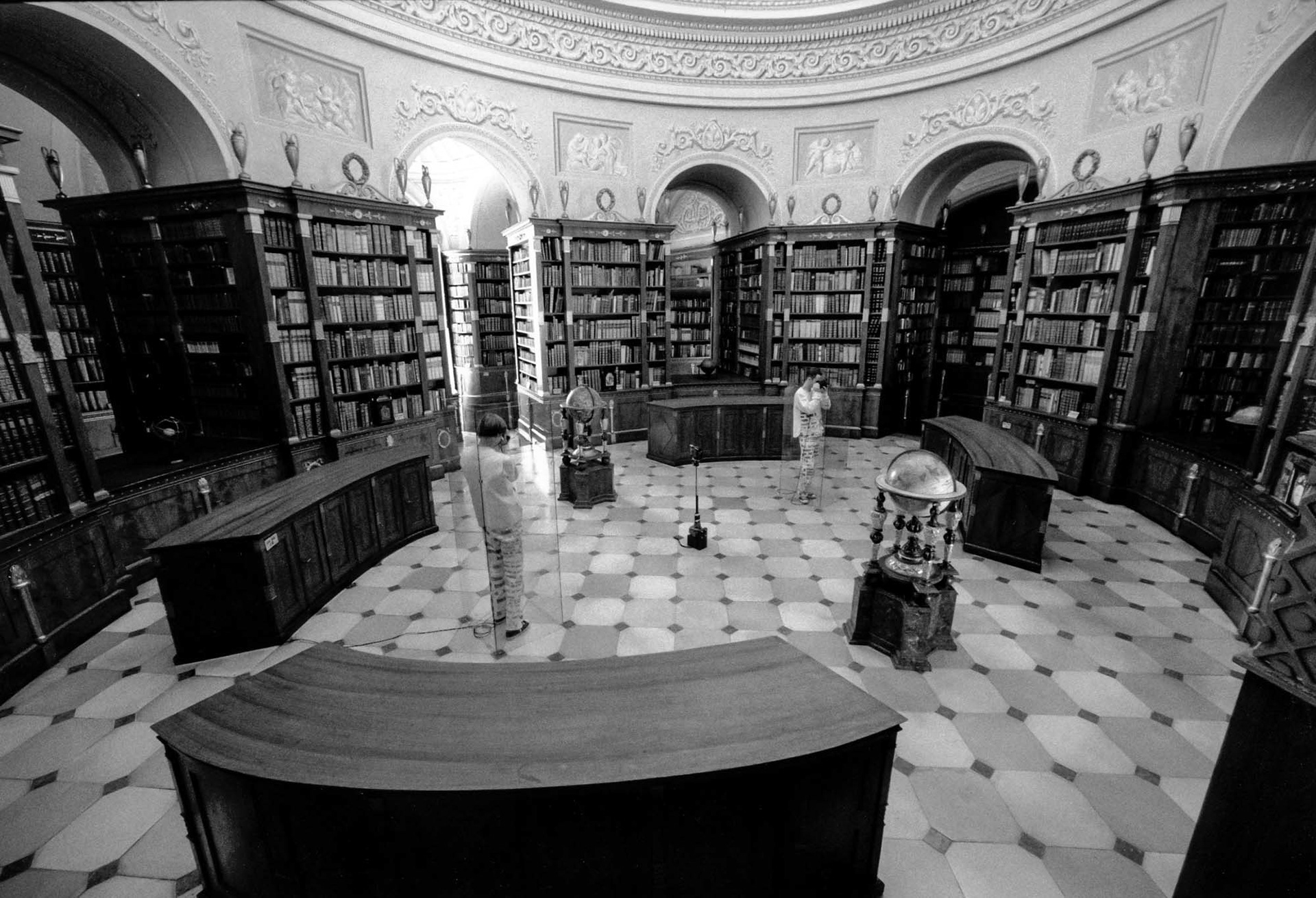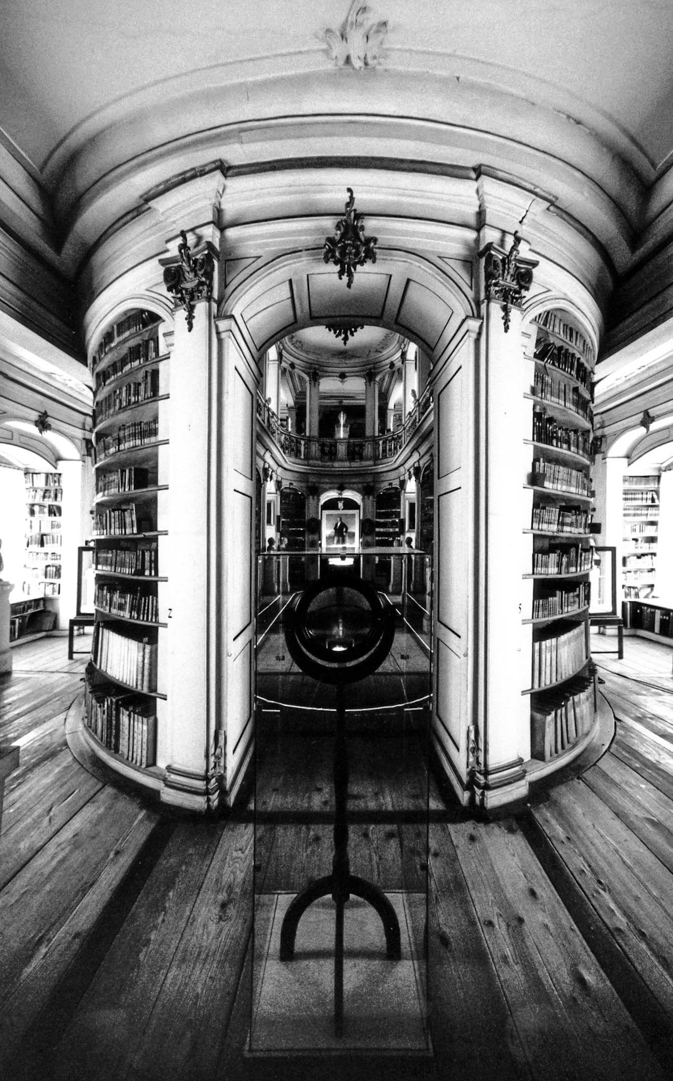 Wenige Jahre nach der Wende realisierte der Künstler und Mediendesigner Herbert Moser das Projekt „Dialogo“ (als Buch unter gleichnamigem Titel erschienen im Cantz Verlag, Ostfildern 1996). Schauplätze seiner einjährigen Reise waren vier berühmte historische Bibliotheken – die Herzogin Anna Amalia Bibliothek (Weimar), die Wiener Nationalbibliothek, die Stiftsbibliothek Klosterneuburg und die Stiftsbibliothek in Schlierbach bei Linz. Moser setzte sich intensiv mit diesen für die Neuzeit so typischen Einrichtungen auseinander – als Mensch, der liest, sammelt, archiviert und zeichnet. „Das Medium Licht ermöglicht mir Eingriffe in Räume, ohne diese baulich zu verändern – quasi ein optisches Sezieren“, sagt der Künstler. Lichtplastiken – generiert mittels transparenter Vorlagen, die über Diaprojektoren als Lichtlinien in die Räume projiziert werden – standen dabei konzeptionell im Vordergrund, eingesetzt wurden aber auch Vitrinen, Videokameras und Monitore. Als fotografisch herausfordernd gestaltete sich das Erfassen der komplexen räumlichen Situationen im Kontext mit der jeweiligen künstlerischen Intention. Und natürlich die Arbeit in großteils nahezu völliger Dunkelheit – unter steter Beachtung der pfleglichst zu behandelnden, wertvollen Exponate. Die Fotos entstanden noch analog, überwiegend durch Langzeitbelichtungen.