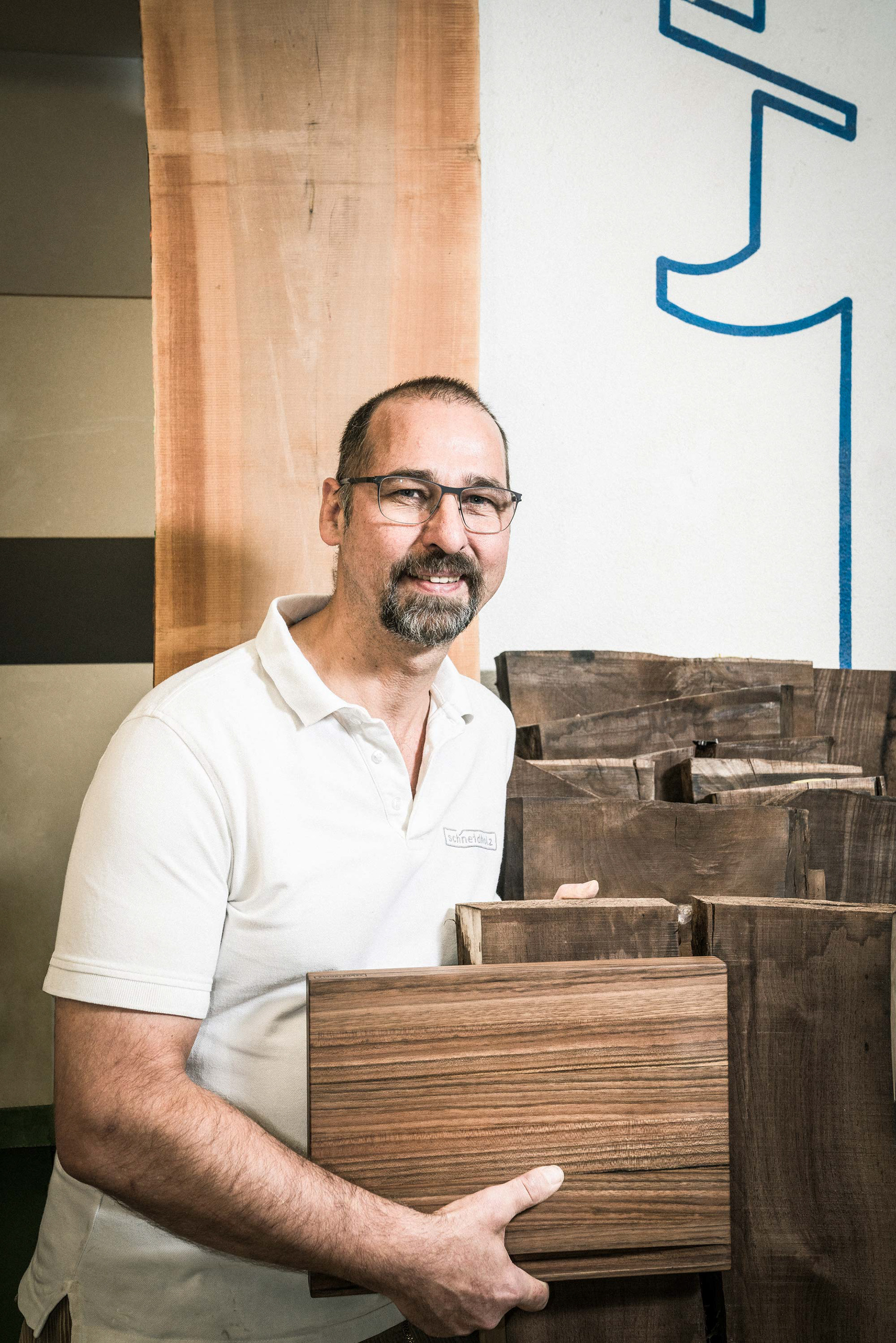 Clemens Müller von der Schneidholz Manufaktur verwandelt die am besten geeigneten Stücke FSC-zertifizierter Laubhölzer in Unikate, die als edle Schneidunterlage viele Jahre Küchenfreude garantieren. Spezielle Oberflächenbehandlungen unterstreichen die natürliche Schönheit des Holzes und verstärken dessen hygienische Eigenschaften. Für die Fotos musste ich in der florierenden Schreinerei erst einmal optisch ruhige und die Bildaussage unterstützende Hintergründe finden/ arrangieren. Mit Blitzen arbeitete ich gegen die Neonbeleuchtung, und erzielte so die gewünschte Stimmung. Schneidholz-Pflegetipp von Clemens Müller: 100er-Schleifpapier und Rapsöl.