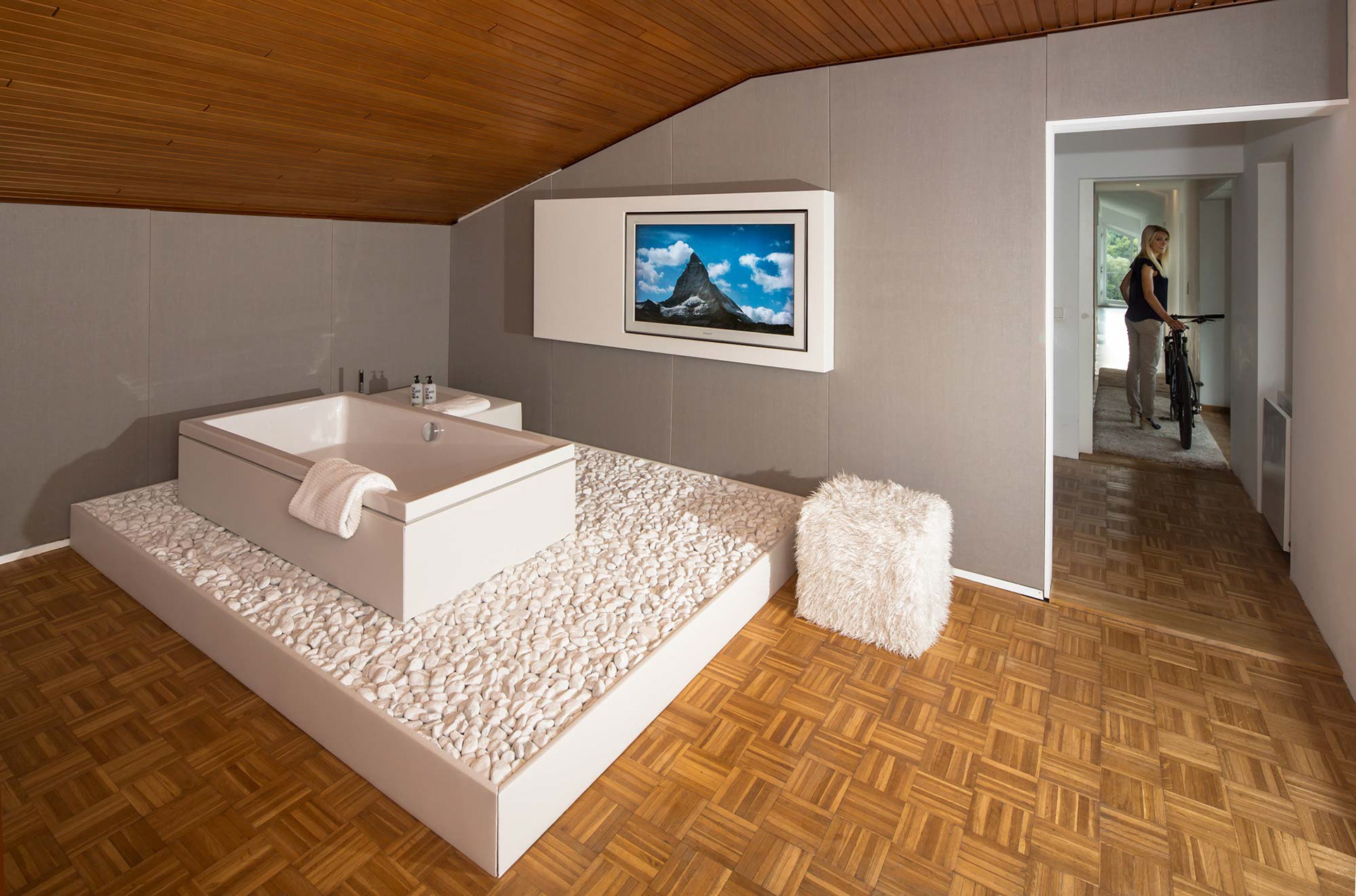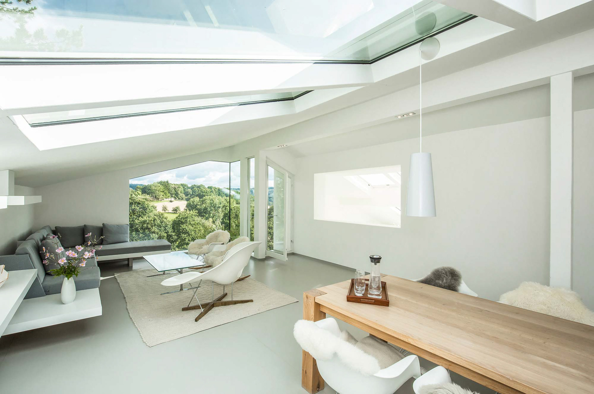 Mit viel Eigenleistung verwandelten Architekt Karl Kaffenberger und seine Ehefrau Natalie (auf dem Foto mit ihrem Hund Louis) den Dachboden des großelterlichen Hauses in eine Traumwohnung. Sparsamer Einsatz von Trennwänden – eine davon ist beheizt – und große Fensterflächen verleihen den dynamisch wirkenden Räumen Weite und Offenheit. Zwischensparrendämmung mit Steinwolle und eine Lage Holzweichfaserplatten sorgen für einen bauphysikalisch optimalen Dachaufbau, vor Überhitzung schützen außenliegende Jalousien. Bereits bestehende Teilausbauten sind elegant in das Konzept integriert (Holzdecken und Eichenparkett).