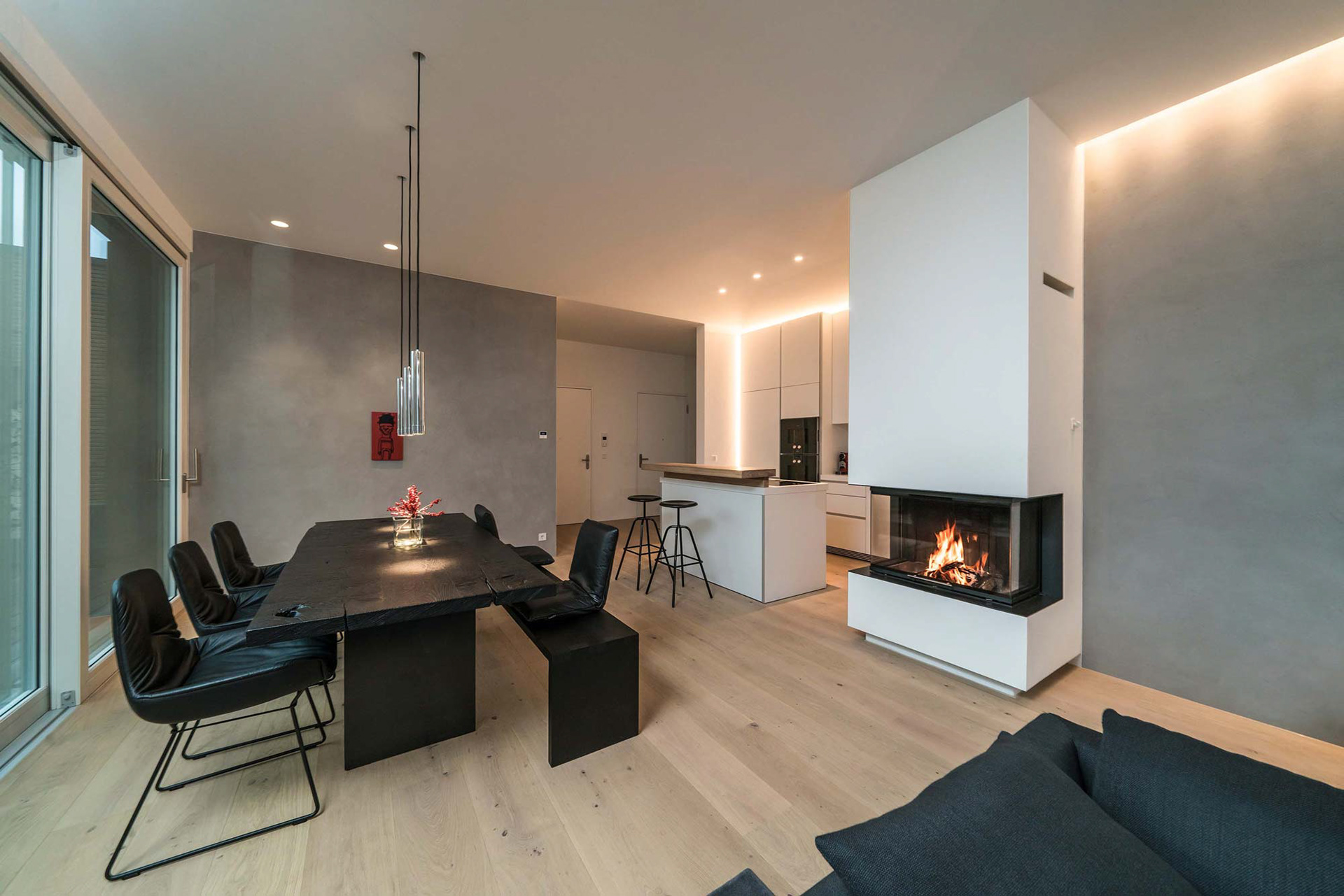 Für die Firma Ernst Kachelofenbau dokumentiere ich eine Reihe hochwertiger Heizkamine und Kachelöfen. Die Projekte stellen fotografisch ganz unterschiedliche Herausforderungen. Im Fokus der visuellen Aufmerksamkeit steht in der Regel ein möglichst gut brennendes und optisch ansprechendes Feuer. Die Anlagen sind dann plastisch herauszuarbeiten, wobei je nach Situation bis zu einem halben Dutzend Blitze zum Einsatz kommen. Auch soll die Materialität der verwendeten Komponenten – etwa eine erstklassig aus Beton gegossene Ofenbank oder eine großflächige Verkleidung mit hochglänzendem Naturstein – möglichst gut zur Geltung kommen.